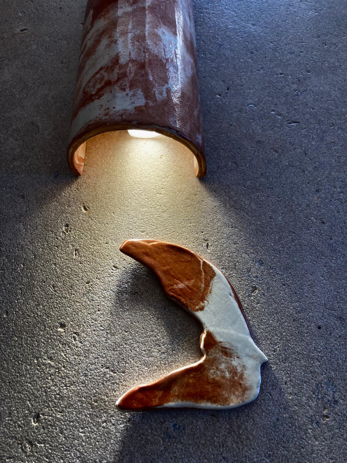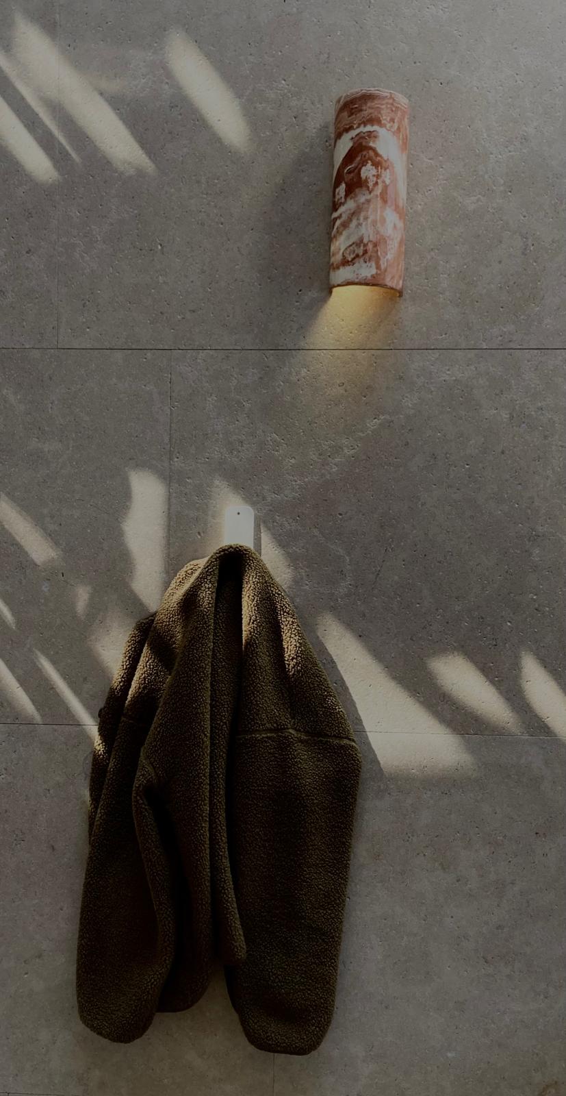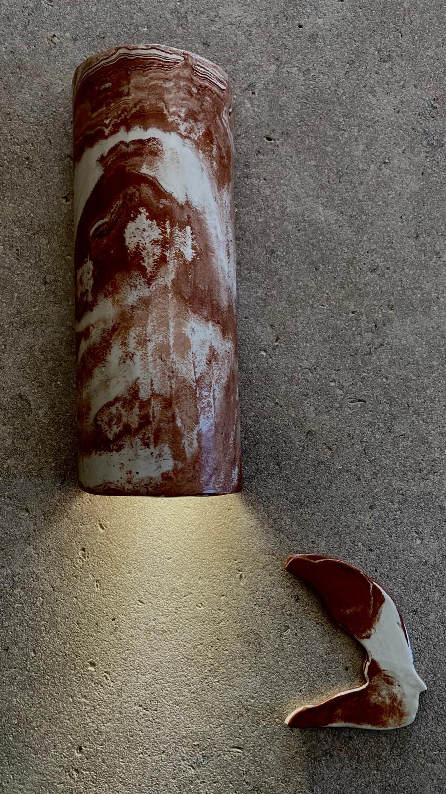 ORIGINE est une applique murale en faïence artisanale, façonnée à la main et travaillée en terres mêlées : un marbrage minéral, organique, jamais tout à fait le même. Une pièce qui accroche la lumière le jour, et la diffuse avec douceur le soir.